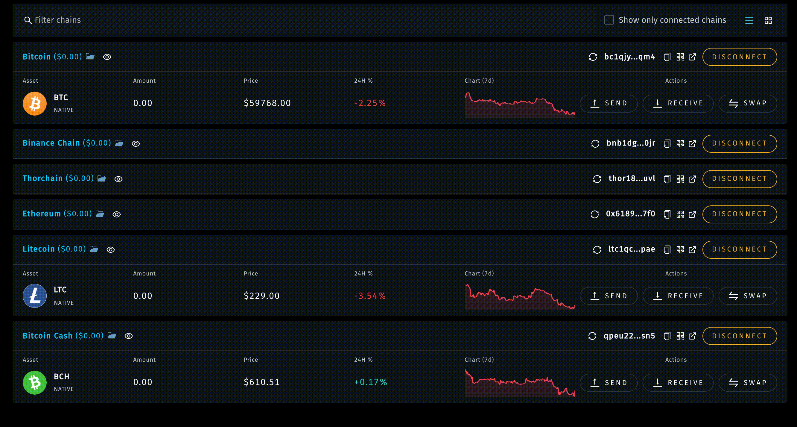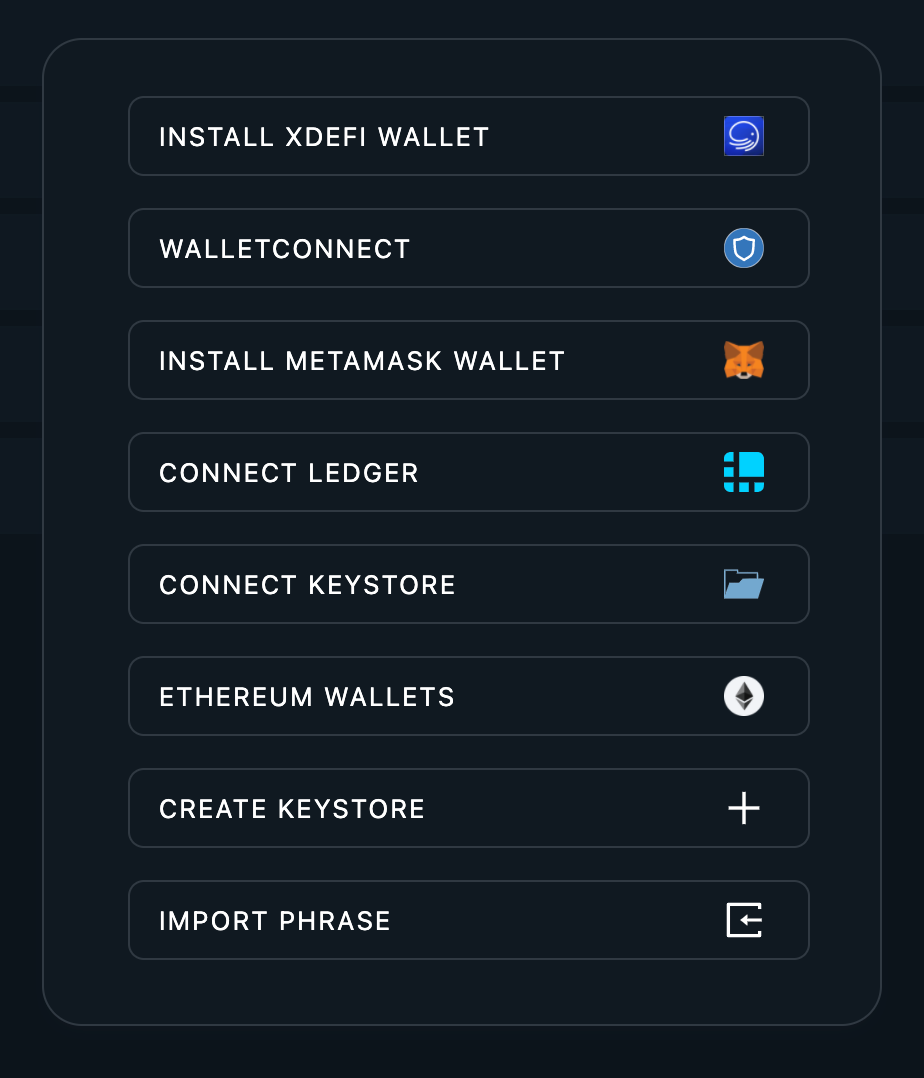 I didn't feel like connecting a hardware wallet, so I created a keystore. A keystore is a password-protected file that holds the information necessary to access wallets on the THORChain-supported blockchains. Quite a mouthful. It is one file that suffices to let you transact in Bitcoin, Ethereum, etc. At first, I was a little skeptical and wondered, "what if I send funds to these wallets but, for some reason, THORSwap stops functioning, and I lose money?". Worry not; once you've created a keystore, THORSwap lets you see the 12-word seed for each blockchain. Pretty neat! This mechanism allows you to restore a THORSwap wallet in the alternative wallet software/hardware/solution of your choice.