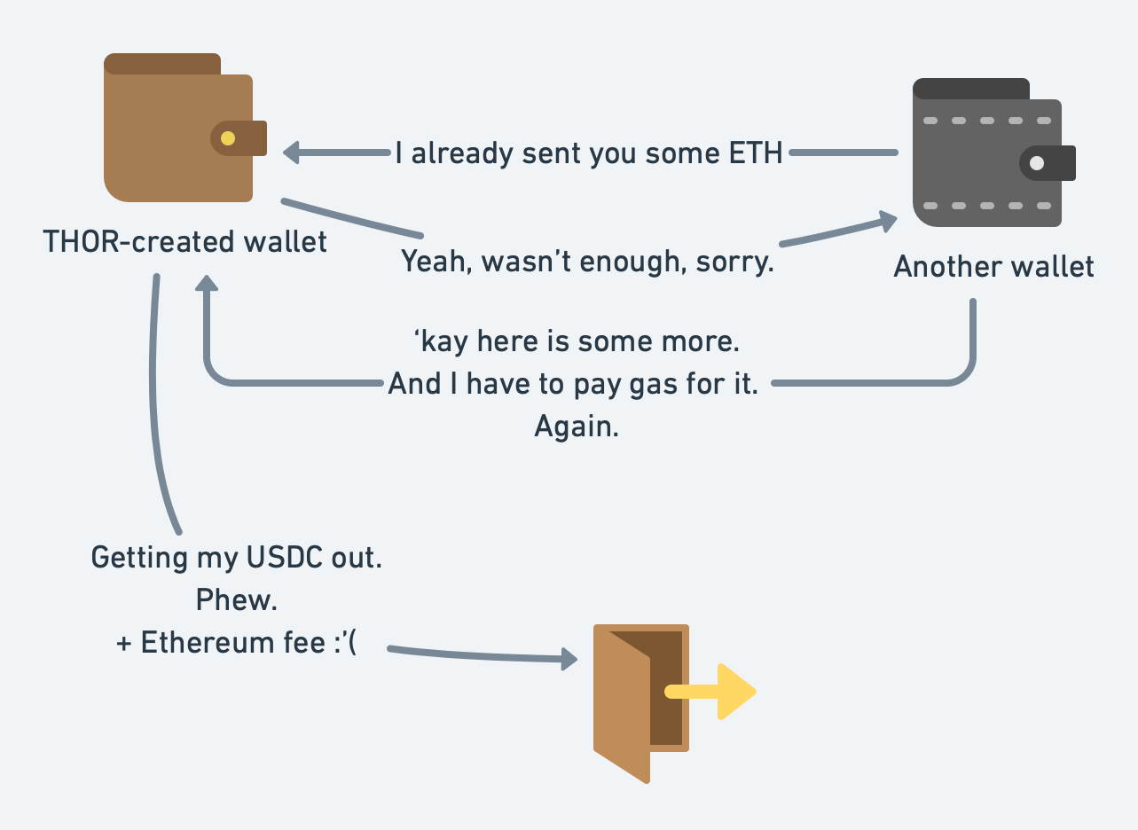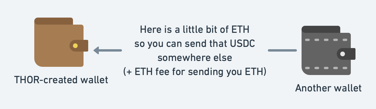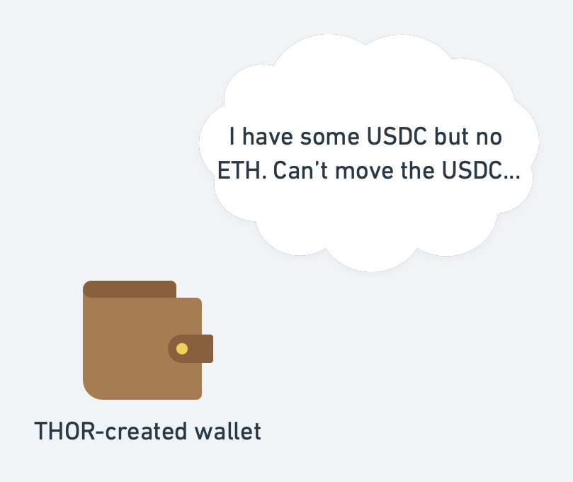 For a minute there, I felt like I'd been bamboozled. I was also spooked about my little savings money being stuck forever. That's right: USDC is a token on the Ethereum blockchain. In order to transfer any Ethereum-borne token, you have to have ETH. Bringing USDC from BlockFi to my THORSwap wallet had been a "free" transfer, courtesy of BlockFi. But this THORSwap wallet of mine had no Ethereum at all. Stuck, I tell you.