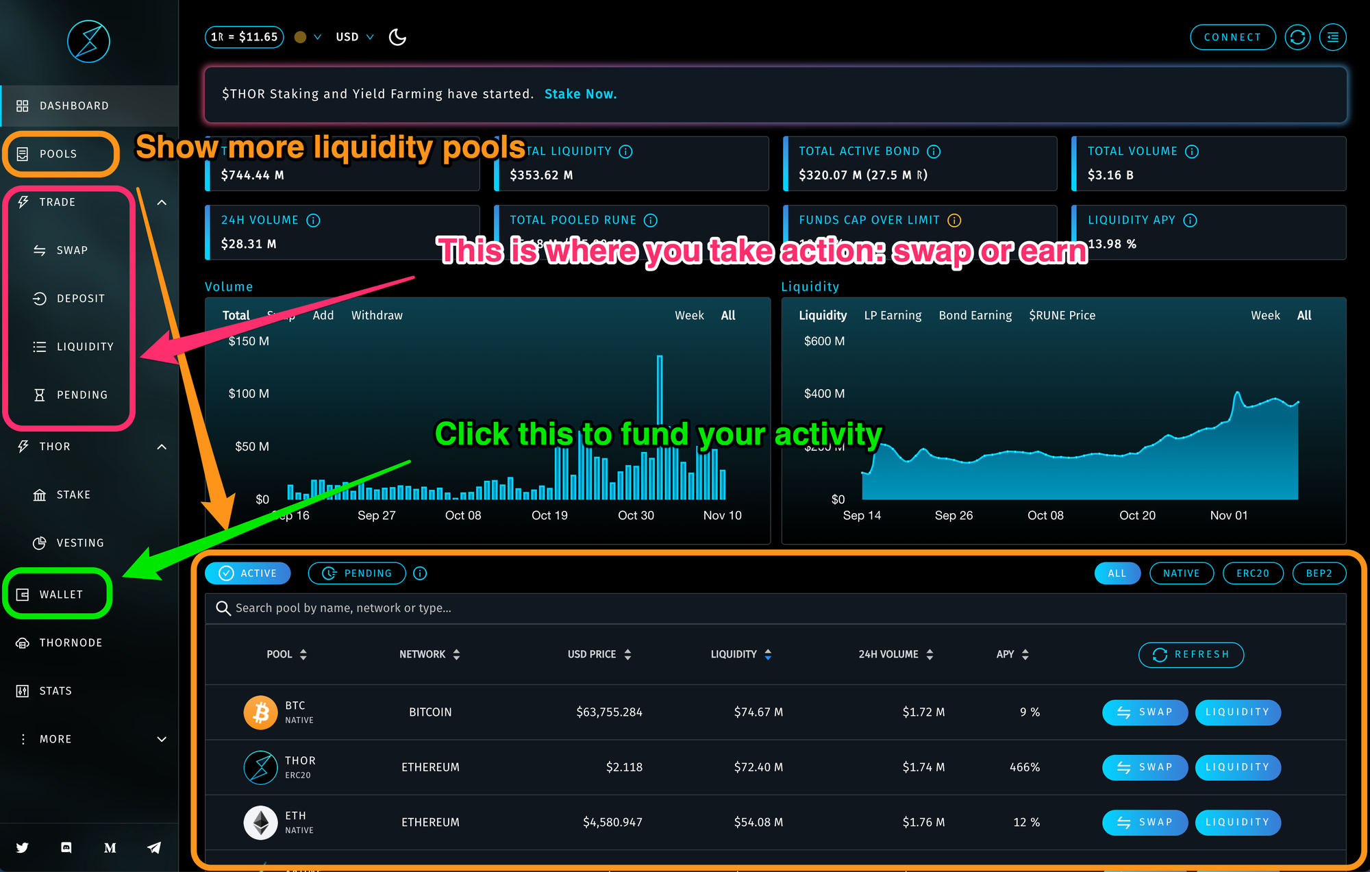One more thing: It's early days for THORChain. Risky days. On November 12th, THORChain lost consensus and halted. Activity resumed ~5 days later. THORChain suffered an $8M hack in July. On November 26th, THORChain Midgard and THORSwap Midgard went down. These services act like read-only mirrors, providing layer 2 real-time data and analytics. This meant that no data was shown in THORSwap. At the time of this writing, there is still no data in the THORSwap desktop app. The webapp app.thorwap.finance is fine.